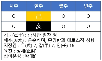 기해일주 남자의 경우, 일지 정재의 영향으로 현명한 배우자를 맞이하고 백년해로 할 수 있는 일주입니다.