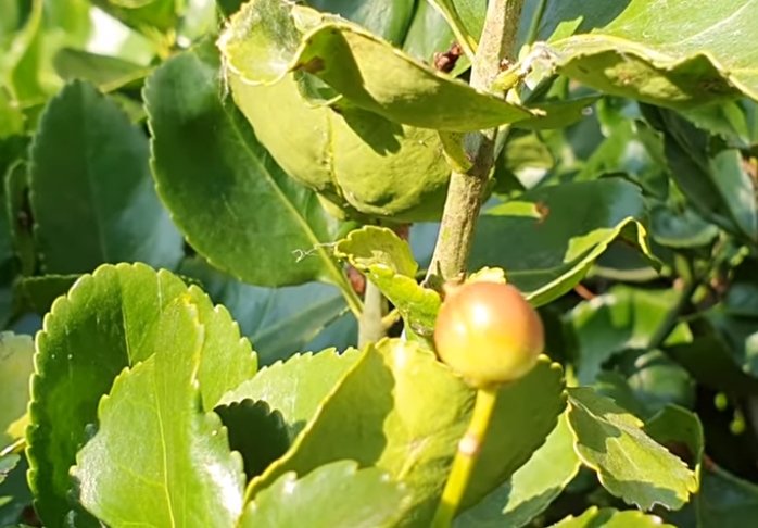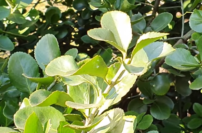 잎은 마주나고 타원형이며 가죽질로 두텁고 길이는 3~7cm, 너비는 3~4cm 정도이고 표면에 윤기가 있으며 뒷면은 황록색이고 가장자리는 둔한 톱니가 있습니다.