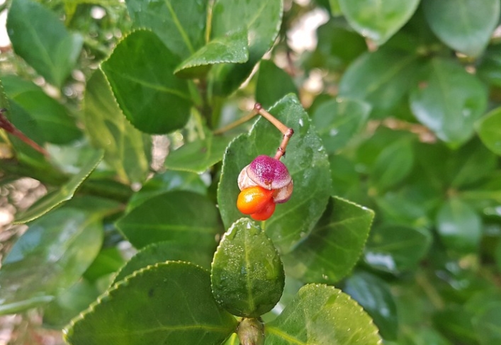 사철나무는 노박덩굴과 화살나무속의 상록활엽관목으로 학명은 (Evergreen spindletree)입니다. 우리나라는 황해도에서 제주도까지 폭 넓게 분포하는데, 사시사철 늘 푸르고 향나무나 소나무와 달리 넓은 잎을 가지고 있어 사철나무라고 이름이 붙여졌다고 하네요.